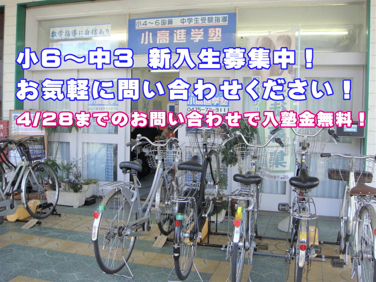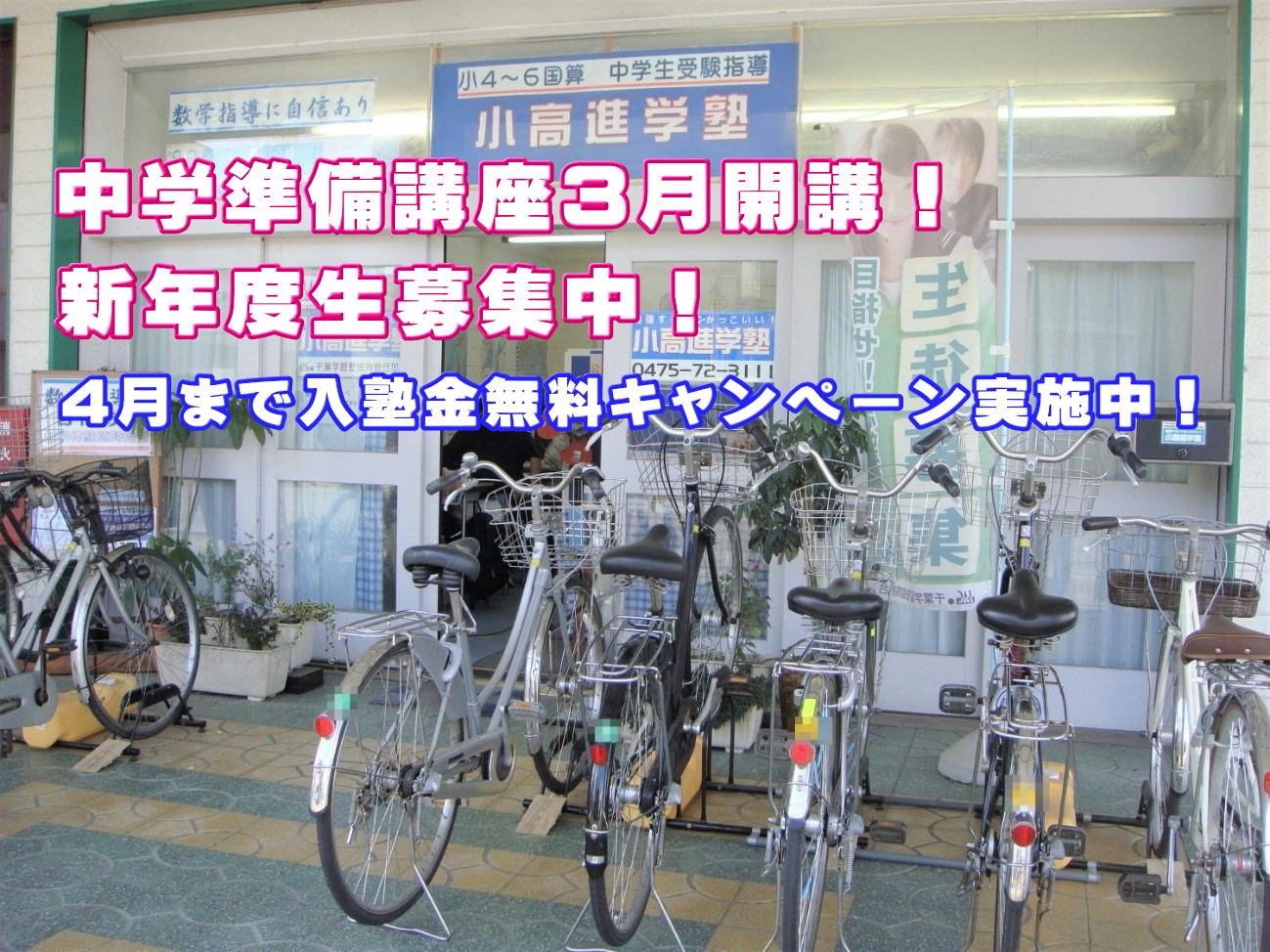 - 中学準備講座のご案内をアップしました。なお、新年度の塾生募集ですが、新中3生につきましては満席のため募集をしておりません。ご了承ください。